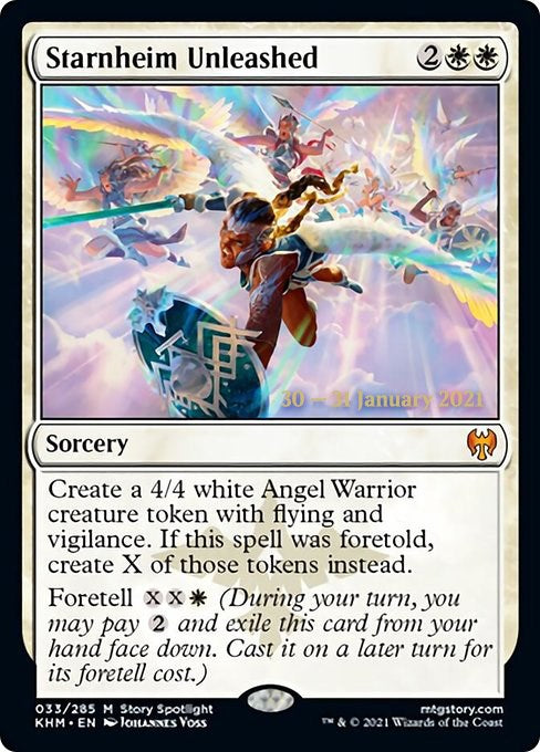 • Rules Text Contains: Create a 4/4 white Angel Warrior creature token with flying and vigilance. If this spell was foretold, create X of those tokens instead.