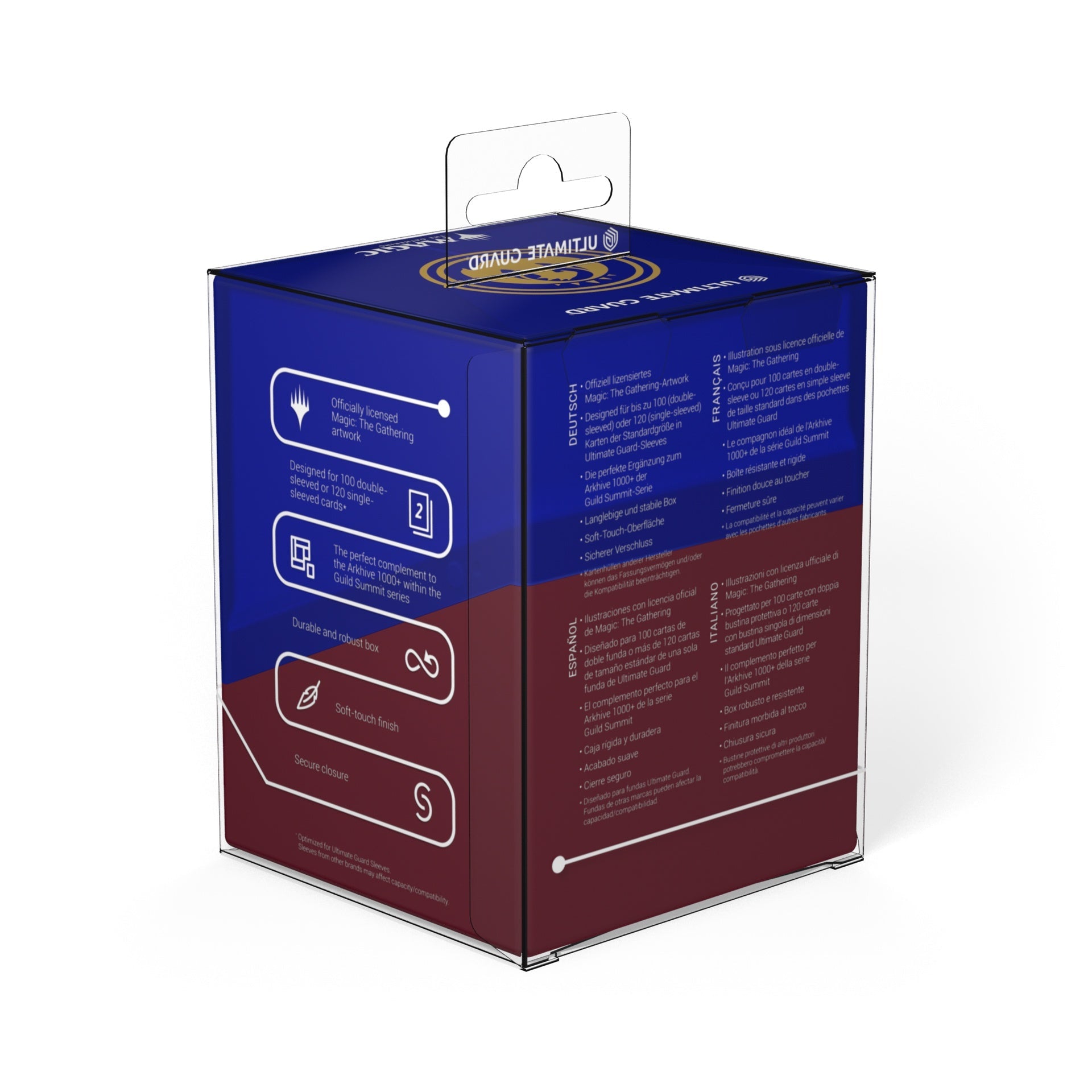Ultimate Guard celebrates one of the most iconic and popular planes in Magic: The Gathering's history with the "Guild Summit" series: Ten elegant Boulder 100+ featuring the golden crest of each guild on the semi-transparent deck boxes, all with a silky soft-touch finish. The Boulder 100+ holds up to 100 double-sleeved cards, making it the perfect home for your two-color Commander deck! Don't miss out on the stunning Arkhive 1000+ Xenoskin from the "Guild Summit" series either, which is the perfect storage place for up to ten Boulder 100+.